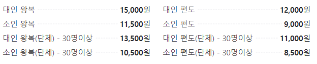 - 대인 : 왕복 15,000원 / 편도 12,000원