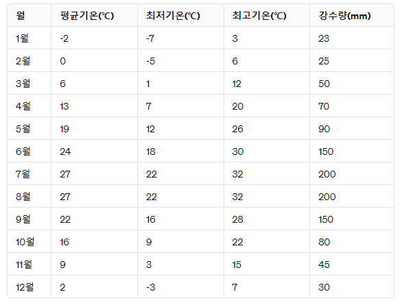 - 최고 기온: 35°C 이상으로 상승할 때가 많아 더운 여름을 보낼 수 있습니다.
