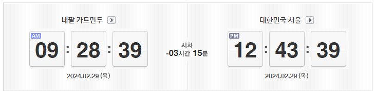 서울과 네팔 사이의 시차는 3시간 15분입니다. 네팔이 서울보다 3시간 15분 늦습니다. 즉, 서울이 오후 12시일 때, 네팔은 오전 9시입니다.