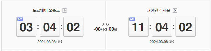 대한민국 서울과 노르웨이의 시차는 8시간입니다. 노르웨이가 서울보다 8시간 뒤에 있습니다. 예를 들어, 서울이 오전 11시라면 노르웨이는 오후 3시입니다.