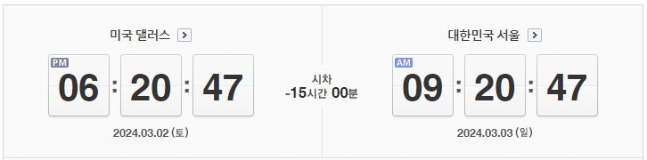 대한민국 서울과 미국 텍사스주 댈러스 사이의 시차는 15시간입니다. 댈러스가 서울보다 15시간 뒤에 있스니다. 즉, 서울이 오전 9시 일 때, 댈러스는 전일 오후 6시 입니다.