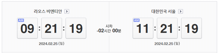 서울과 라오스 간의 시차는 일반적으로 2시간입니다. 라오스는 서울보다 2시간 느립니다. 즉, 서울이 오전 11시라면 라오스는 오전 9시가 됩니다.