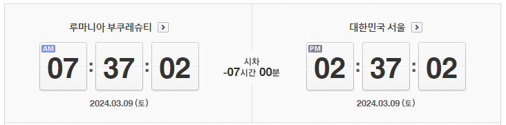 서울과 루마니아의 시차는 7시간입니다. 즉, 루마니아는 서울보다 7시간 뒤에 있습니다. 예를들어, 서울이 오후 2시라면 루마니아는 오전 7시입니다.