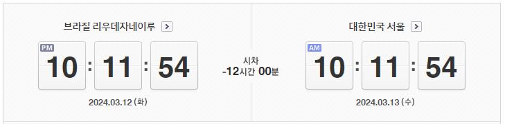 서울과 리우데자네이루 간의 시차는 12시간입니다. 리우데자네이루는 서울보다 12시간 뒤에 있습니다. 예를 들어, 서울이 오전 10시라면 리우데자네이루는 전날 오후 12시입니다.