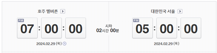 대한민국 서울과 멜버른의 시차는 2시간입니다. 멜버른이 서울보다 2시간 빠릅니다. 즉, 서울이 오후 5시 일 때, 멜버른은 오후 7시 입니다.