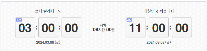 대한민국 서울을 기준으로 몰타의 시차는 8시간입니다. 몰타가 서울보다 8시간 뒤에 있습니다. 즉, 서울이 오전 11시라면 몰타는 오후 3시입니다.