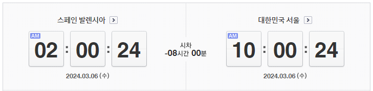 서울과 발렌시아의 시차는 8시간입니다. 발렌시아는 서울보다 8시간 뒤에 있습니다. 즉, 서울이 오전 10시 일 때, 발렌시아는 오전 2시 입니다.