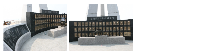 위령탑은 사고지점으로부터 2.5km 떨어진 언덕위에 세워진 탑으로 천안함 침몰로 순직하신 46명용사들의 얼굴들을 형상화하여 추모,묵념하게 되있는곳이며, 주 탑 아래에는‘꺼지지 않는 불꽃’을 설치하여 놓았다.