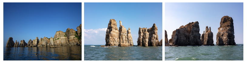 (선대바위, 촛대바위, 코끼리바위, 병풍바위, 장군바위 등) 두문진포구에서 유람선을 타고 10여분을 포구를 지나서부터 펼쳐지는 암석의절벽에 펼쳐지는 비경으로 백령도 서북쪽 해안을 따라서 4킬로 가량 50-100미터 높이의 규암 절벽이 평풍 처럼 늘어서 있는모습을 볼수가 있다.