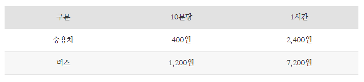 - 승용차: 400원(10분) / 2,400원(1시간)