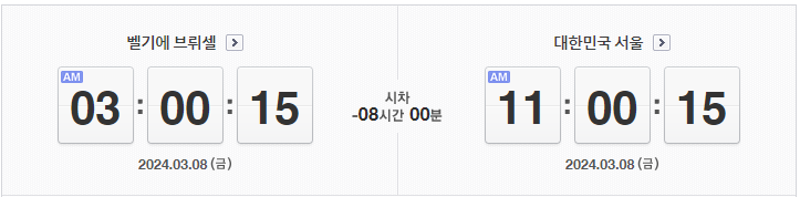서울과 브뤼셀의 시차는 8시간입니다. 브뤼셀이 서울보다 8시간 뒤에 있습니다. 즉, 서울이 오 11시라면 브뤼셀은 오전 3시 입니다.