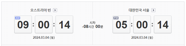 비엔나와 서울 간의 시차는 8시간입니다. 비엔나가 서울보다 8시간 뒤에 있습니다. 즉, 서울이 오후 5시일 때, 비엔나는 오전 9시 입니다.