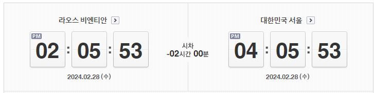 서울과 비엔티안의 시차는 2시간입니다. 비엔티안은 서울보다 2시간 늦습니다. 즉, 서울이 오후 4시라면 비엔티안은 오후 2시가 됩니다.