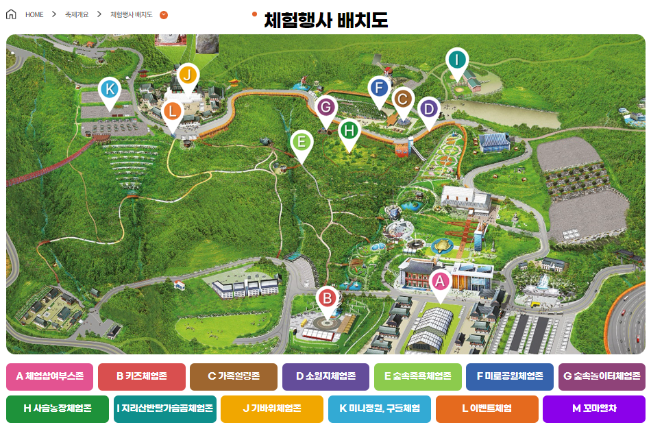 가족힐링존, 키즈체험존, 미니정원 및 구들체험, 소원지체험존, 숲속족욕체험존, 이벤트체험, 기바위체험존, 미로공원체험존, 숲속놀이터체험존, 사슴농장체험존, 지리산반달가슴곰체험존, 모바일스탬프투어