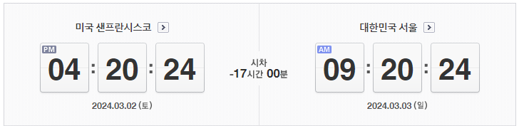 서울과 샌프란시스코 사이의 시차는 17시간입니다. 샌프란시스코가 서울보다 17시간 뒤에 있습니다. 즉, 서울이 오전 9시 일 때, 샌프란시스코는 전일 오후 4시 입니다.