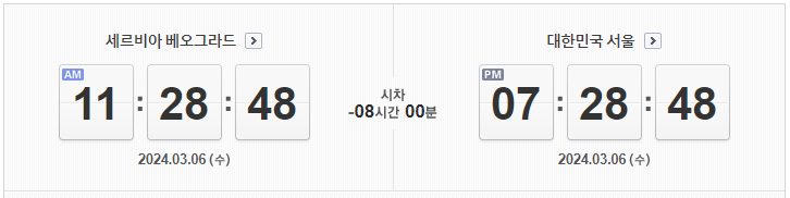 서울과 세르비아의 시차는 8시간입니다. 세르비아가 서울보다 8시간 뒤에 있습니다. 즉, 서울이 오후 7시일 때, 세르비아는 오전 11시입니다.