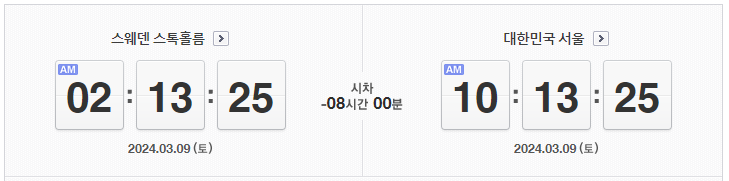 스웨덴과 대한민국 서울과의 시차는 8시간입니다. 스웨덴은 서울보다 8시간 뒤에 있습니다. 즉, 서울이 오전 10시라면 스톡홀름은 오전 2시가 됩니다.