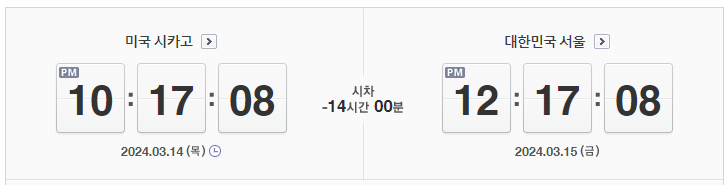 서울은 시카고의 시차는 14시간 입니다. 시카고가 서울보다 14시간 뒤에 있습니다. 즉, 서울이 오후 12시라면 시카고는 전날 오후 10시입니다.