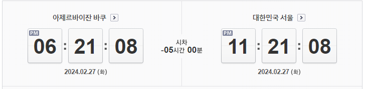 아제르바이잔과 서울의 시차는 5시간입니다.아제르바이잔은 서울보다 5시간 느립니다. 즉, 서울이 오후 11시인 경우 아제르바이잔은 오후 6시입니다.