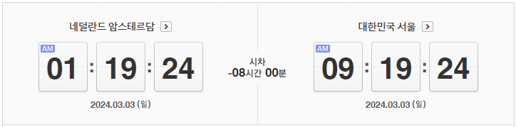 서울을 기준으로 암스테르담의 시차는 8시간입니다. 암스테르담은 서울보다 8시간 뒤에 있습니다. 즉, 서울이 오전 9시 일 때, 암스테르담은 오전 1시 입니다.