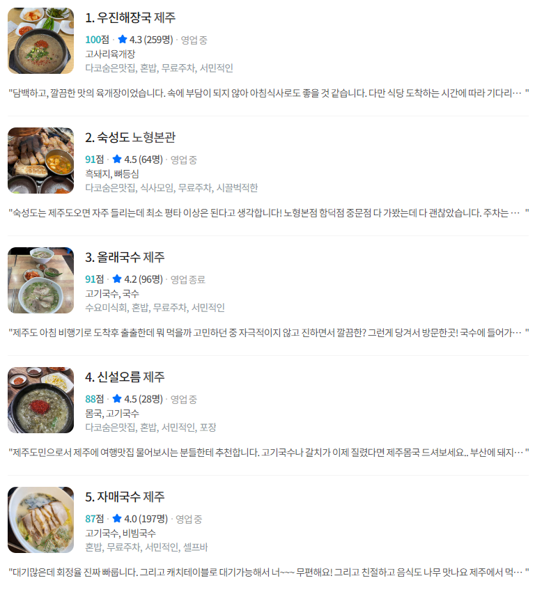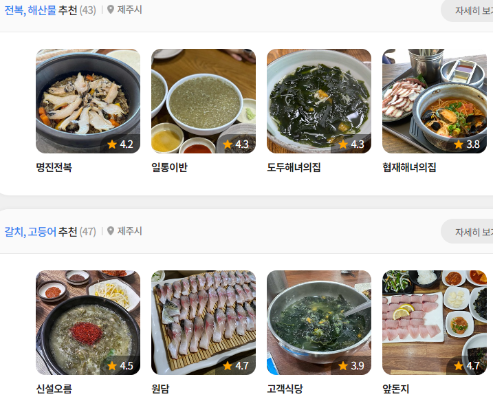 숙성도, 노형본관, 저팔계, 깡통연탄구이, 돈사돈, 고이정, 감성돈, 명진전복, 일통이반, 도두해녀의집, 협재해녀의집, 신설오름, 원담, 고객식당, 앞돈지, 우진해장국, 숙성도노형본관, 올래국수, 신설오름, 자매국수