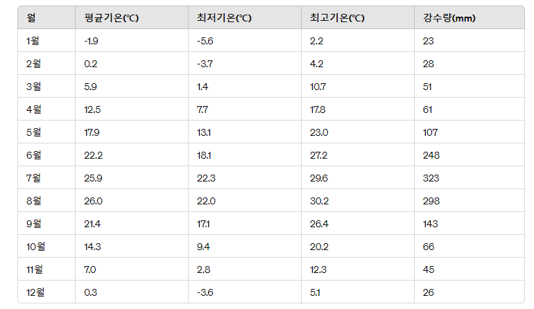 겨울에는 추운 날씨가 계속되며, 특히 12월부터 2월까지는 기온이 굉장히 낮아지는데, 때로는 영하로 떨어지기도 합니다. 겨울에는 따뜻한 옷을 입고 외출하는 것이 중요하며, 겨울 특유의 청명한 날씨와 함께 예쁜 눈景관을 감상할 수 있습니다.