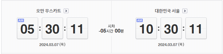대한민국 서울과 오만 사이의 시차는 5시간입니다. 오만이 서울보다 5시간 뒤에 있습니다. 즉, 서울이 오전 10시일 때, 오만은 오전 5시입니다.