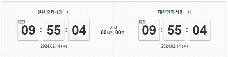 서울을 기준으로 오키나와의 시차는 없습니다. 즉, 대한민국 오전 9시 일 때, 오키나와 역시 오전 9시 입니다.