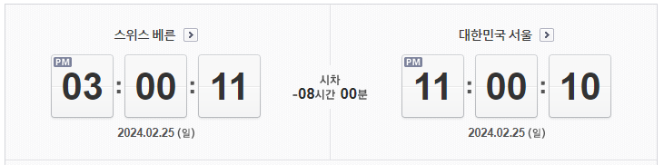 융프라우는 서울보다 8시간 뒤에 위치해 있습니다. 융프라우가 서울보다 8시간 느립니다. 즉, 서울이 오후 11시라면 융프라우는 오후 3시입니다.