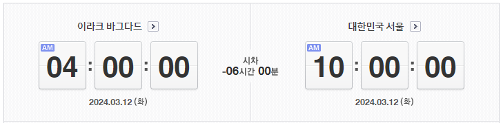 대한민국 서울과 이라크의 시차는 6시간입니다. 이라크가 서울보다 6시간 뒤에 있습니다. 즉, 서울이 오전 10시라면 이라크는 오전 4시입니다.