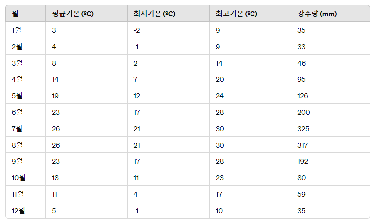 여름에는 더워지는 경향이 있는데, 낮에는 평균적으로 25도에서 30도 이상의 높은 기온을 기록할 수 있습니다. 습한 기후와 함께 소나기가 자주 발생할 수 있습니다.