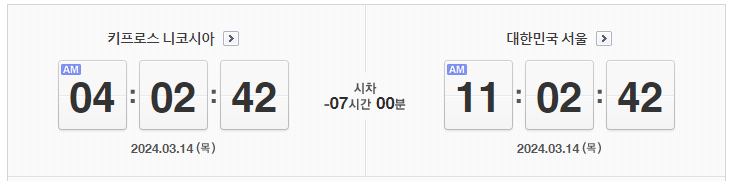 대한민국 서울과 키프로스의 시차는7시간입니다. 키프로스는 서울보다 7시간 뒤에 있습니다. 즉, 서울이 오전 11시라면 키프로스는 오전 4시입니다.