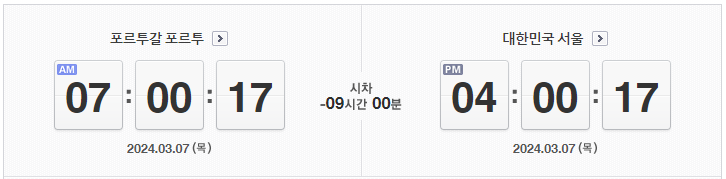 서울과 포르투 간의 시차는 9시간입니다. 포르투는 서울보다 9시간 뒤에 있습니다. 즉, 서울이 오후 4시라면 포르투는 오전 7시입니다.