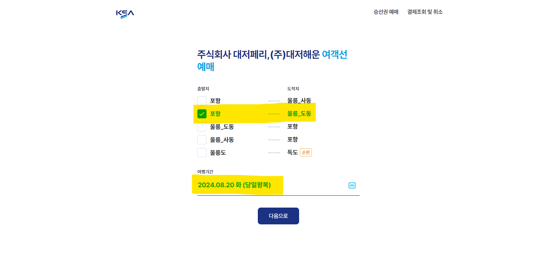 포항에서 울릉도를 배타고 가는 것이 목적이기에, 가장 왼쪽에 위치한 [포항↔울릉]을 선택해줍니다.