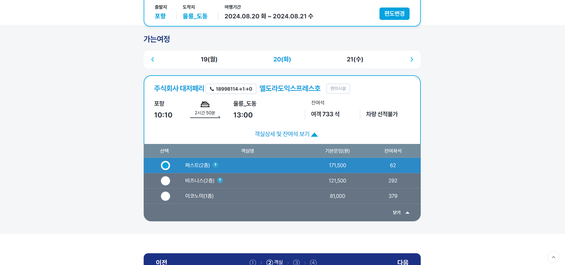 대저페리 엘도라도익스프레스호는 총 3개 등급의 좌석이 준비되어 있습니다. 가장 좋은 좌석은 퍼스트, 그 다음이 비즈니스, 그리고 가장 저렴한 좌석이 바로 이코노미 입니다. 내가 원하는 좌석으로 갈 때와 올 때의 좌석을 선택해줍니다.
