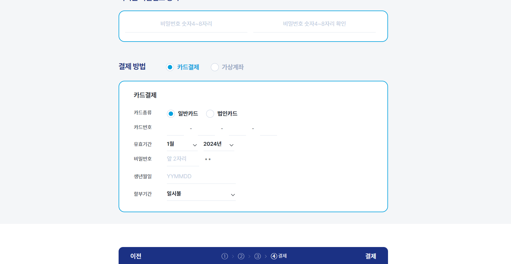 자 드디어 마지막입니다. 이제 결제만 남았습니다. 결제종류는 카드결제와 가상계좌가 있는데요. 카드결제 시, 카드번호와 유효기간, 비밀번호 앞 2자리와 생년월일을 기입하고, 할부기간만 선택하면 바로 결제가 가능합니다.