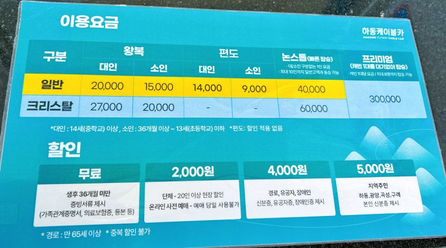 - 논스톱(빠른탑승) : 일반 40,000원 / 크리스탈 60,000원
