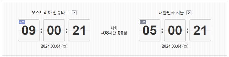 서울과 할슈타트의 시차는 8시간입니다. 할슈타트가 서울보다 8시간 뒤에 있습니다. 즉, 서울이 오후 5시 일 때, 할슈타트는 오전 9시 입니다.