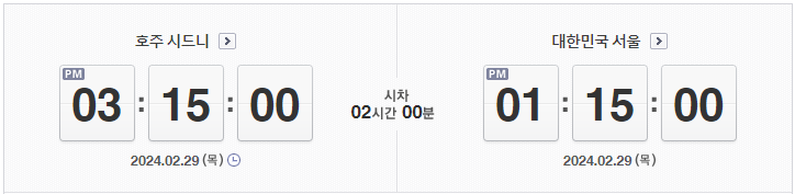 - 호주 동부 표준시(예: 시드니, 멜버른): 서울과 호주 동부 표준시의 시차는 2시간입니다. 시드니가 호주보다 2시간 앞서있습니다, 즉 서울이 오후 1시 일 때, 호주 시드니는 오후 3시입니다.