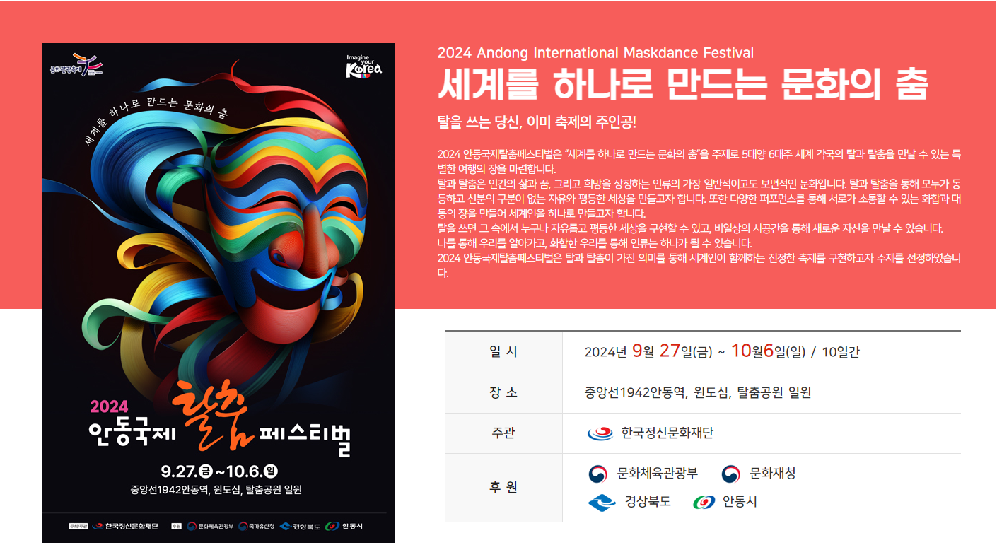<안동국제탈춤페스티벌> 행사내용 안동국제탈춤페스티벌은 매년 경상북도 안동에서 열리는 세계적인 탈춤 축제입니다.