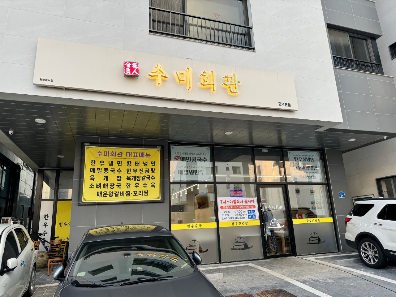 수미회관 고덕본점은 고덕호반써밋 정문에서 도보로 3분 거리에 위치해 있으며, 마포갈비 옆에 있어 찾기 쉽습니다. 가게 앞에 주차장이 마련되어 있어 편리하게 주차 후 식사할 수 있습니다.